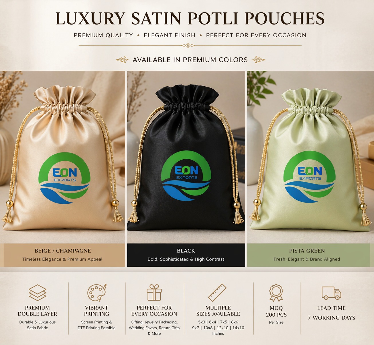 Eon Exports acts as a reliable partner for businesses searching for satin potli bag manufacturers exporters suppliers wholesalers in Mumbai. Instead of working with multiple vendors, we streamline the process by offering: